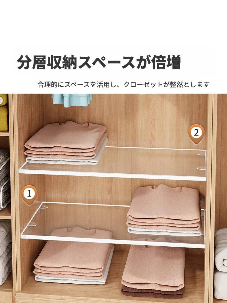 アクリル収納ラック|多段階の仕切りでクローゼットや靴箱をスッキリ整理!シンプルなデザインで衣類や小物の収納に最適な一字型仕切り板。お部屋をスタイリッシュに演出します!