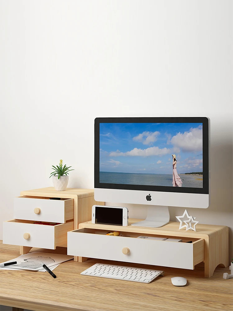 Solid Wood Monitor Stand with Drawer - Stylish Desktop Organizer for Your Office, Elevate Your Screen for Better Posture and Efficiency! Perfect for Home or Workstations.