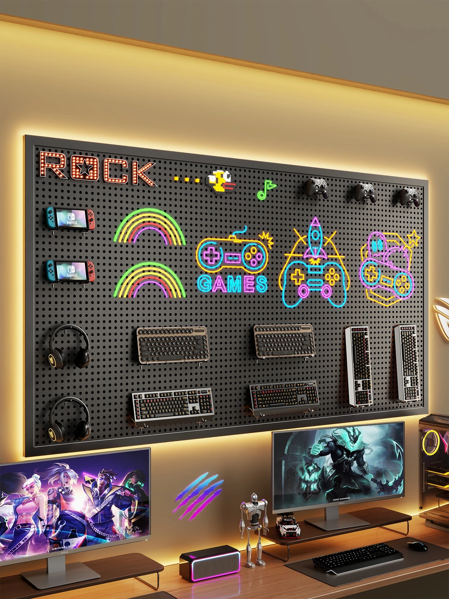 Versatile Pegboard Storage Rack for Gaming and Home Office – Stylish Desk Organizer with Decorative Hooks and Accessories for Computer Desks and Wall Displays